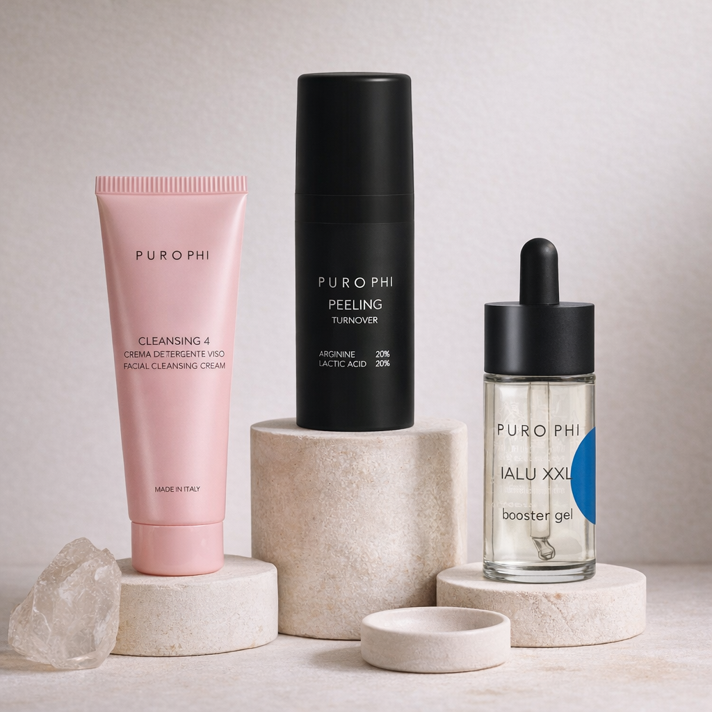I prodotti selezionati lavorano insieme per liberare la superficie dalle cellule morte, uniformare la texture cutanea e restituire turgore e comfort.